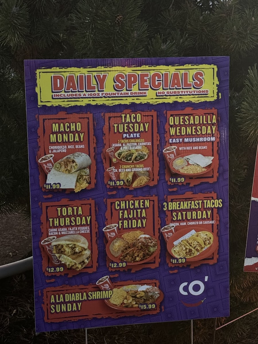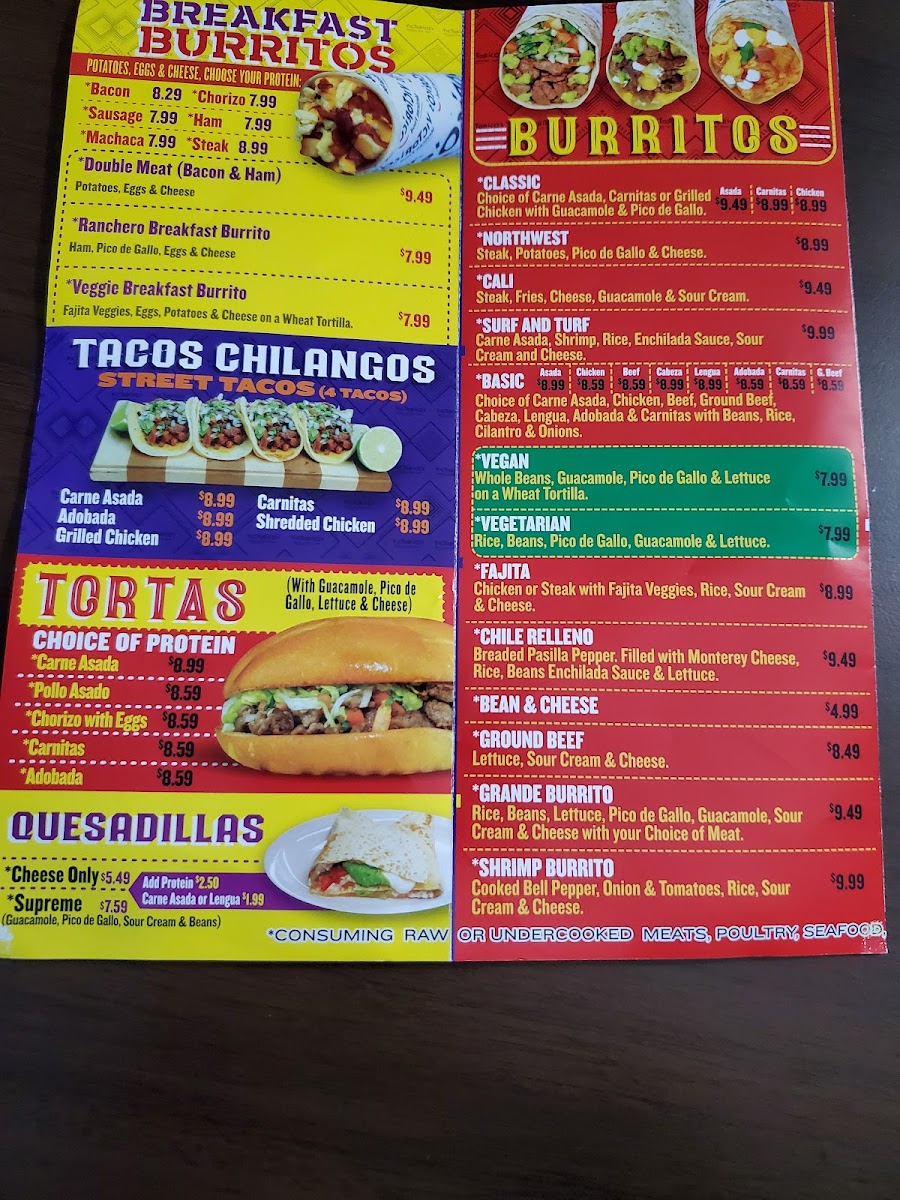 - Sides and Extras: Includes guacamole, sour cream, rice and beans, queso dip, jalapeno slices, and individual items like chile rellenos and enchiladas available with beef or chicken.