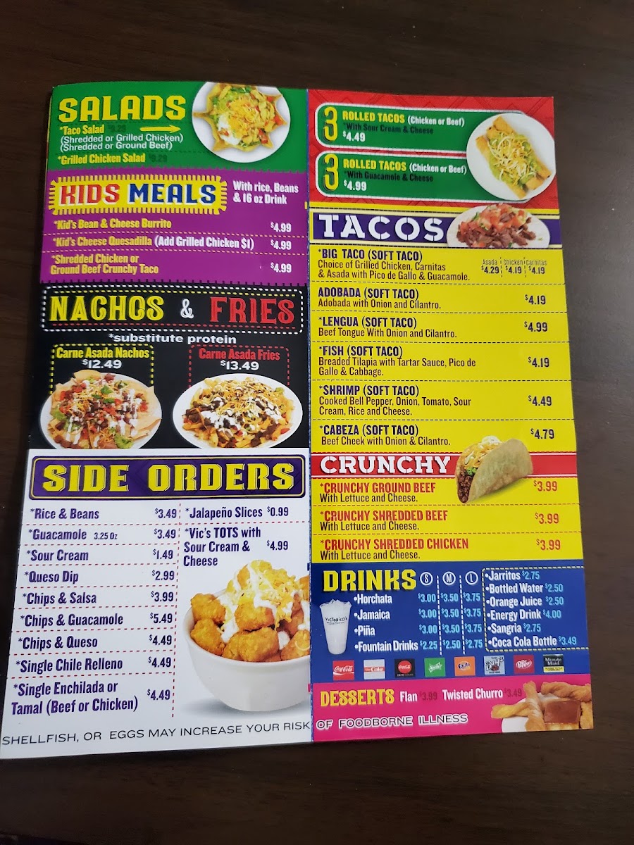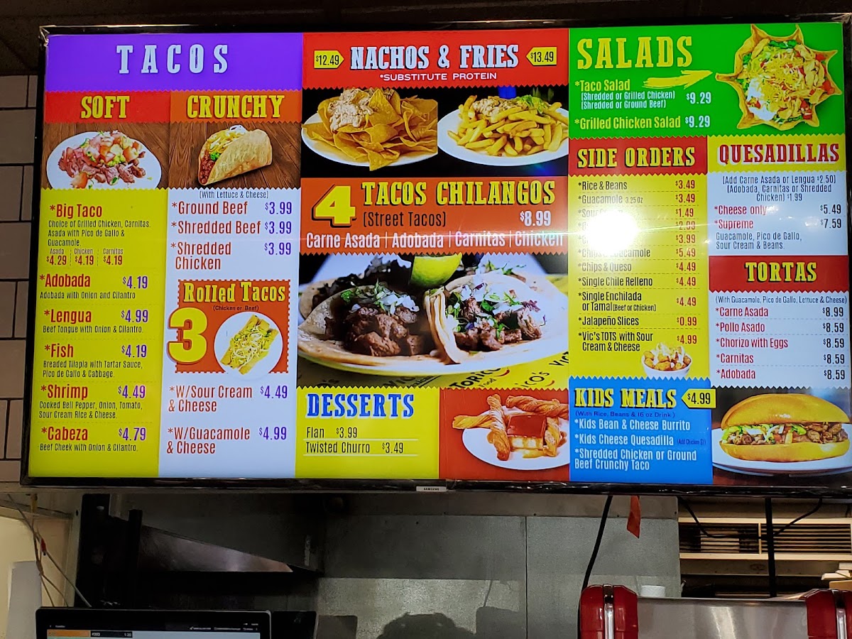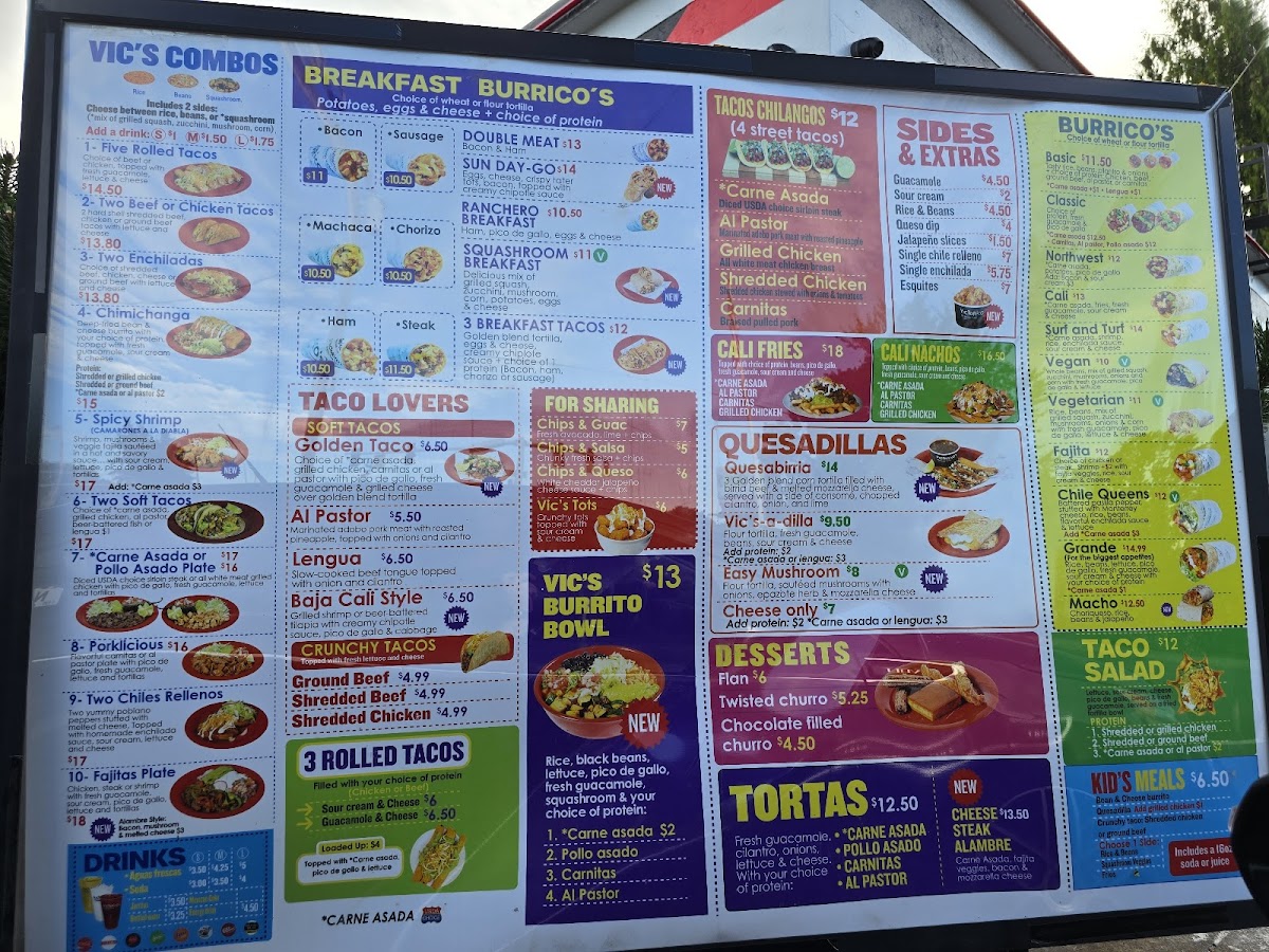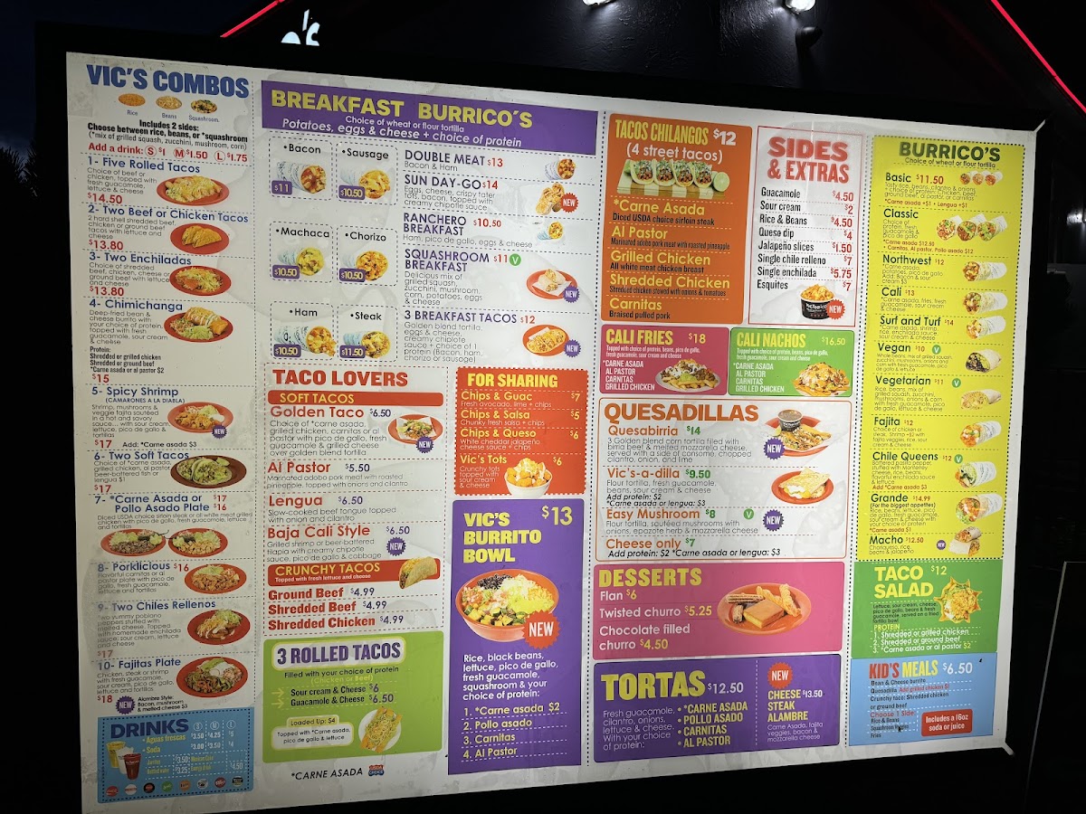 - Main Bowls and Sandwiches: Items such as the Vic's Burrito Bowl with rice, black beans, fresh guacamole, and your choice of protein, as well as Mexican Beef Sandwiches and Chicken Fajitas.