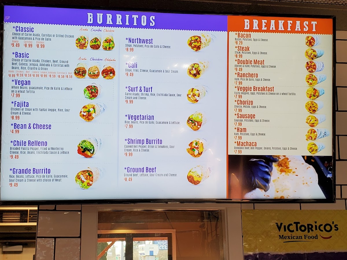 The menu at Victorico's Mexican Food - St. Helens offers a selection of Mexican and fast food items suitable for breakfast, lunch, and casual dining. It features a variety of proteins and traditional Mexican dishes presented in both plated and bowl formats, allowing for quick ordering and convenient meals.